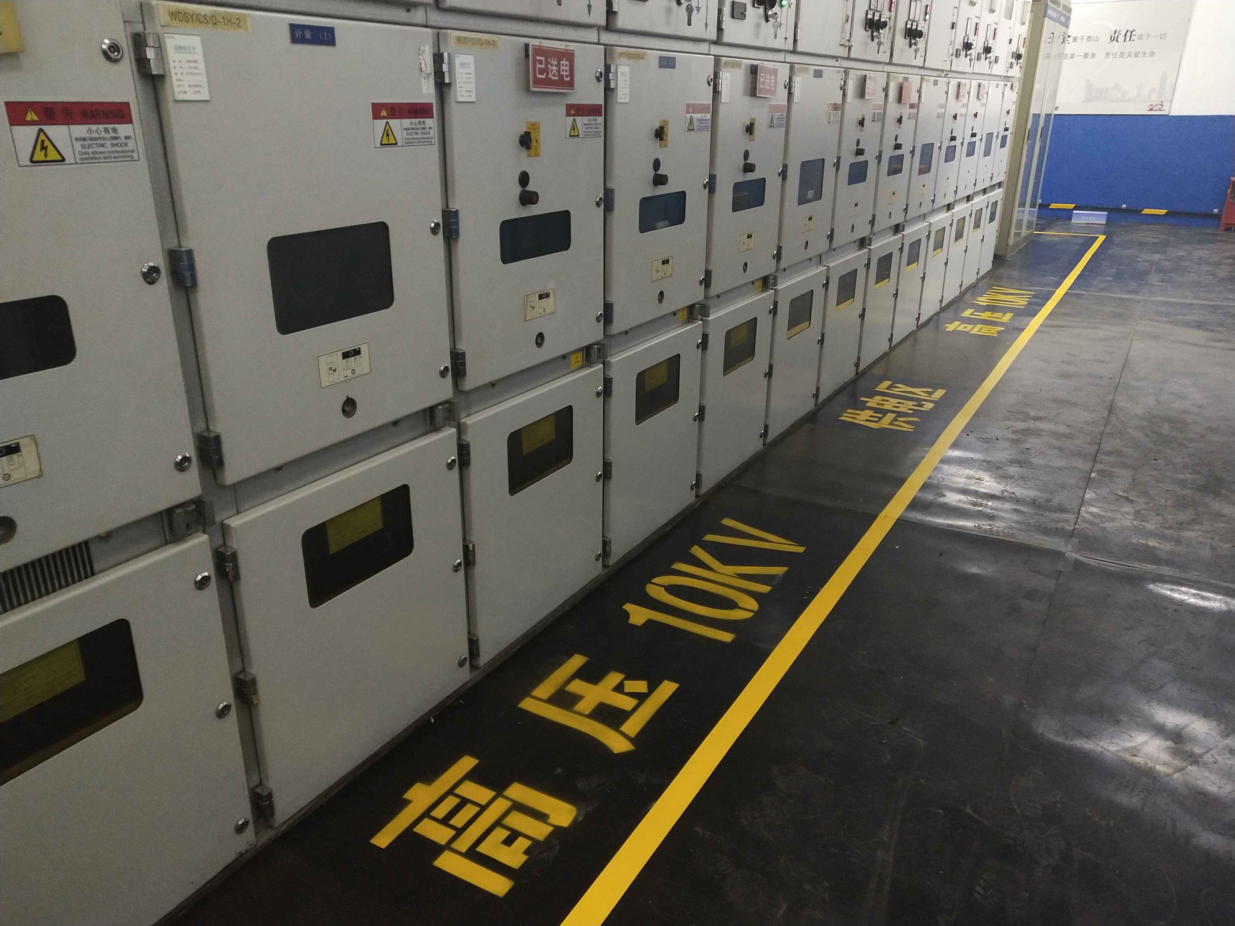 4、地面全部鋪設(shè)絕緣膠墊可以用黃色絕緣膠帶(絕緣漆)規(guī)劃出工作區(qū)域,并在內(nèi)部加上相關(guān)字體,如高壓**千伏等,看起來(lái)大氣非凡,如下圖:
