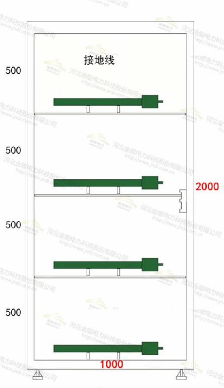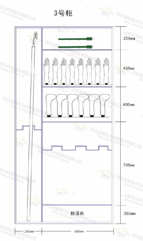 如上圖規(guī)格為2000*800mm,左側(cè)高2000mm,寬200mm存放接地線,右半部分寬600mm,分為4層,其中頂部250mm存放驗電器,下面450mm存放絕緣手套,下面400mm存放絕緣靴,下面700mm可存放令克棒等安全工器具,底部200mm為除濕機。