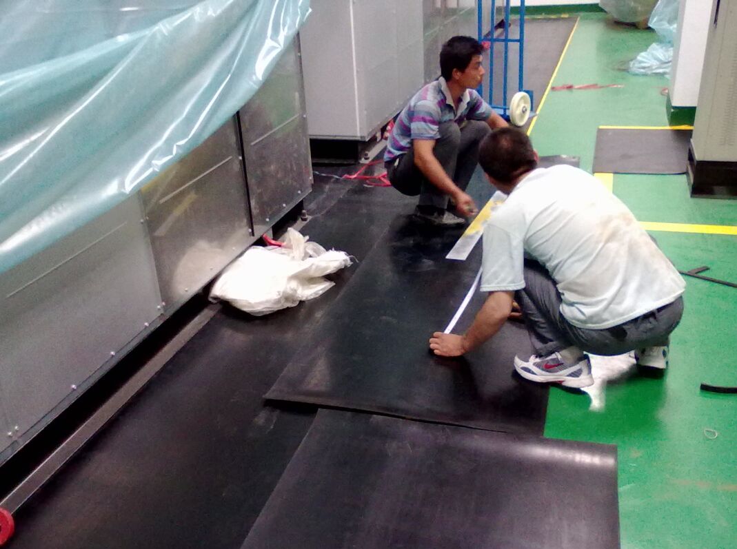 絕緣膠墊本身有一定重量,有較好的抓地性,可以直接平鋪在地面上,一般無需膠水固定;接縫處可用壁紙刀切成斜度45°的切口,對齊拼接后可保證無明顯縫隙,不影響美觀及絕緣膠墊正常使用,如對外觀要求嚴(yán)格可用焊連接。低壓配電室配電柜前后鋪設(shè)即可。