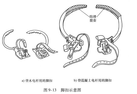 腳扣又稱鐵腳,是電工攀登電桿的主要工具。腳扣分兩種:一種扣環(huán)上帶有鐵齒,供登木桿用;另一種在扣環(huán)上裹有橡膠,供登混凝土桿用。腳扣的結構如圖9 - 13所示,用腳扣攀登電桿具有速度快、登桿方法簡便等特點。